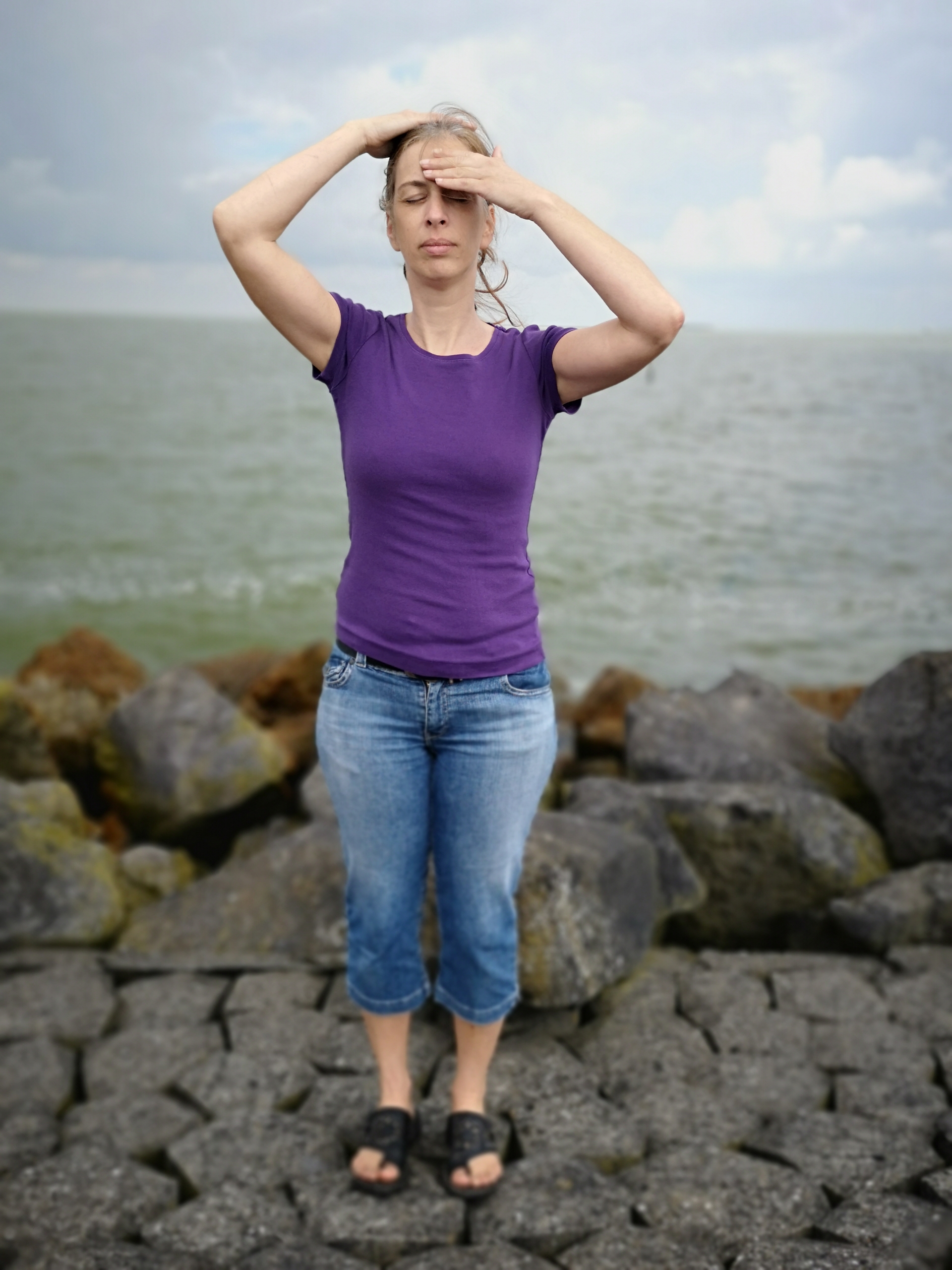 - Leg je RH op je hoofd. (deze blijft hier de hele tijd liggen tot stap 8)
